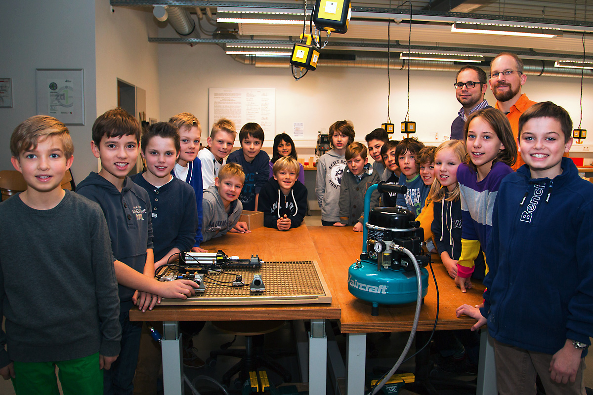 Für den Technikraum des Thomas Morus Gymnasiums hat Venti Oelde einen Kompressor gestiftet. Dieser ist als Ersatz für das alte, sehr laute und den Unterricht störende Gerät gedacht. Gemäß dem Venti-Firmenslogan „Wir lassen Luft für Sie arbeiten“ erzeugt der Kompressor Druckluft für die von den Schülern angefertigten Pneumatik-Komponenten. Einige Fünftklässler haben stellvertretend für die älteren Mitschüler den Kompressor in Empfang genommen. Das Foto zeigt sie mit den Lehrern Benedikt Große Frie (li) und Dirk Hanke an einem Modell, das das Prinzip der Pneumatik verdeutlicht.